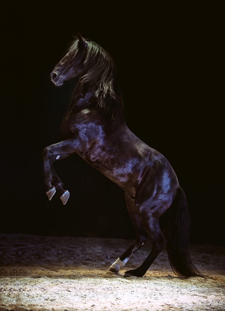 Expresivo y enérgico. Tiene una doma artística muy poco común. Su equilibrio corporal y mental le permite realizar hermosos ejercicios de galope hacía atrás, convirtiéndolo en un caballo muy especial en nuestras obras.